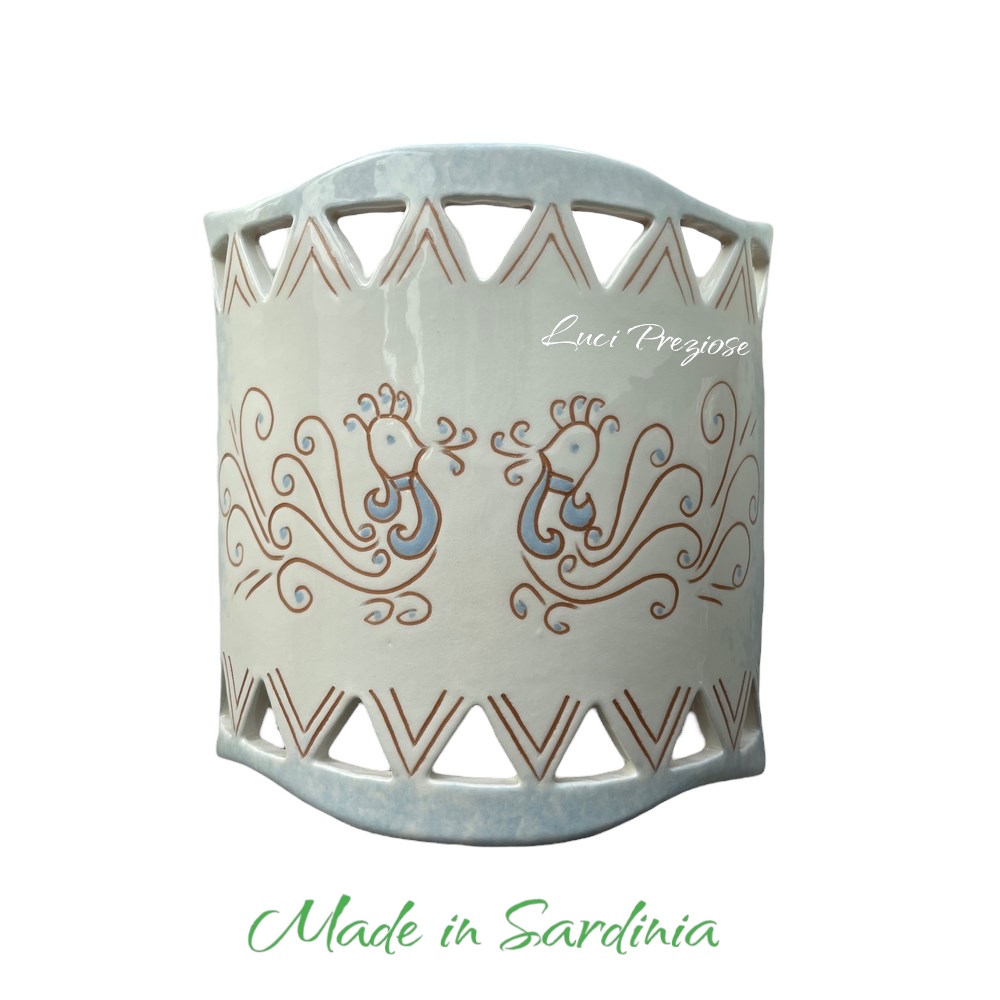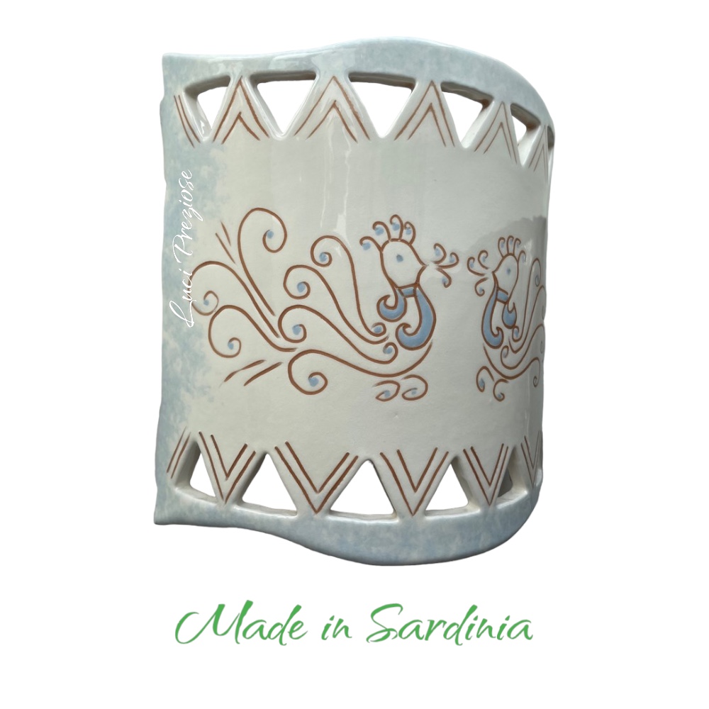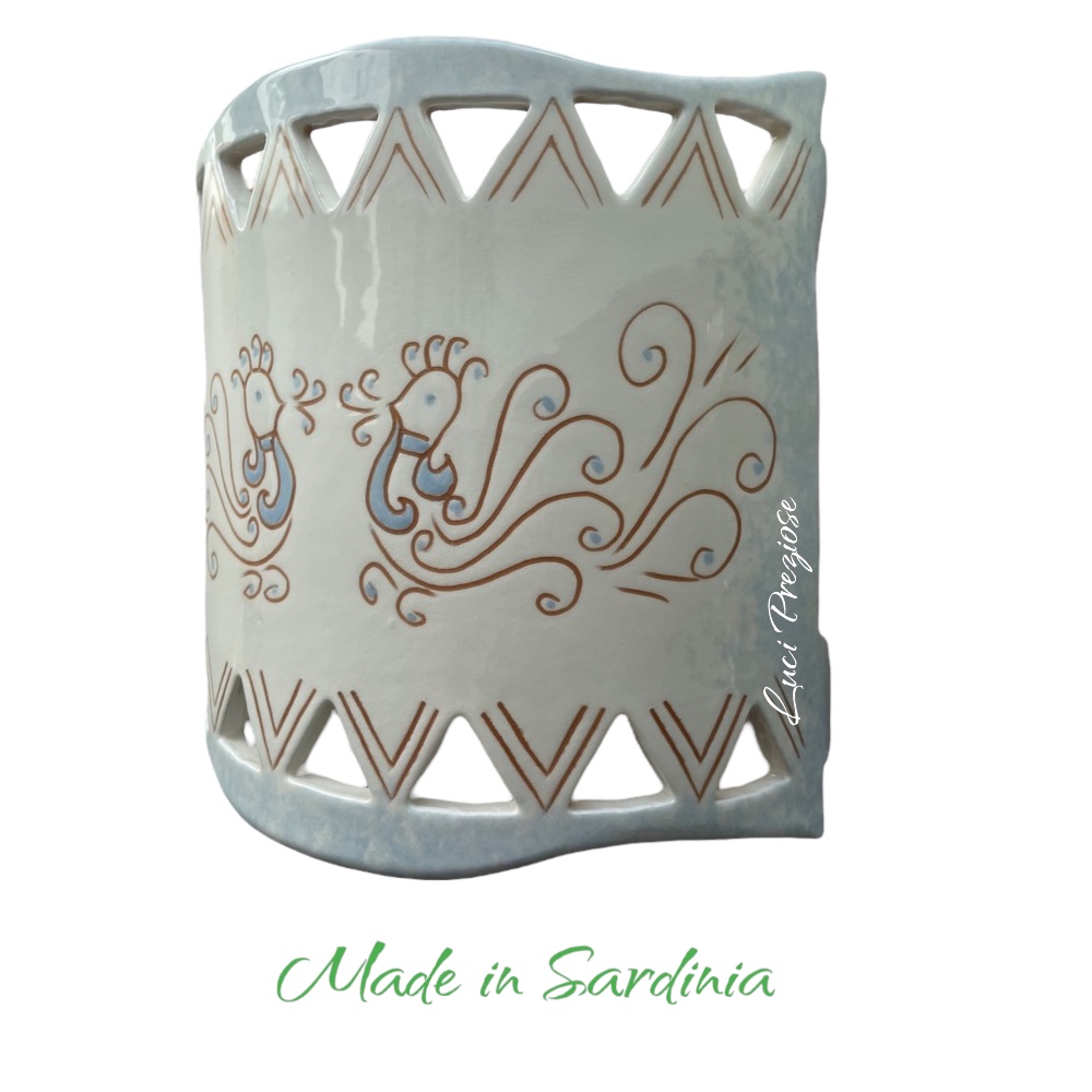 Ceramica lavorata e disegnata a mano nei colori bianco,cotto e celeste