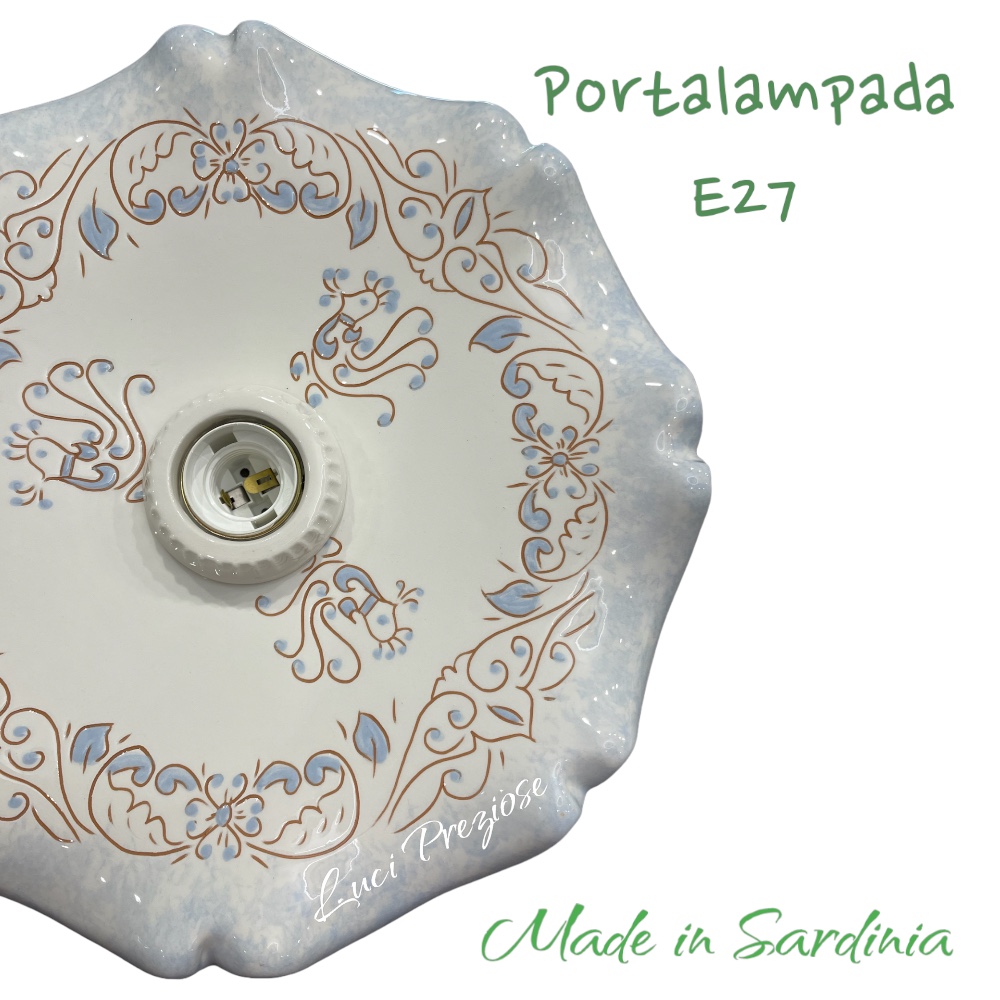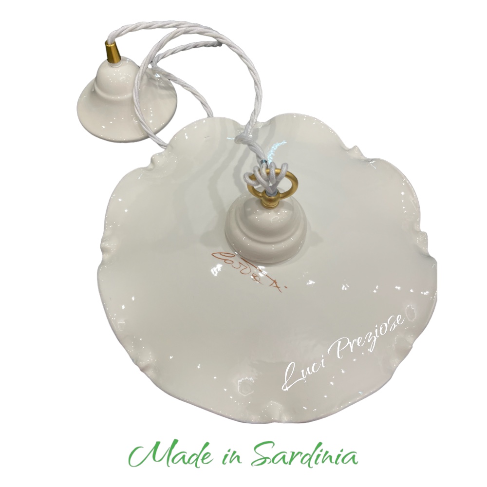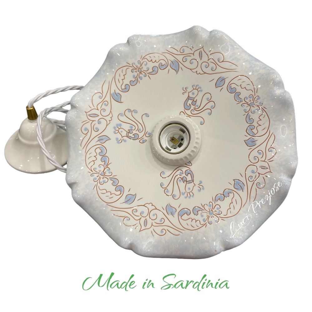 Ceramica lavorata e disegnata a mano nei colori panna cotto e celeste Montatura con filo treccia bianco regolabile - lunghezza max:105 cm