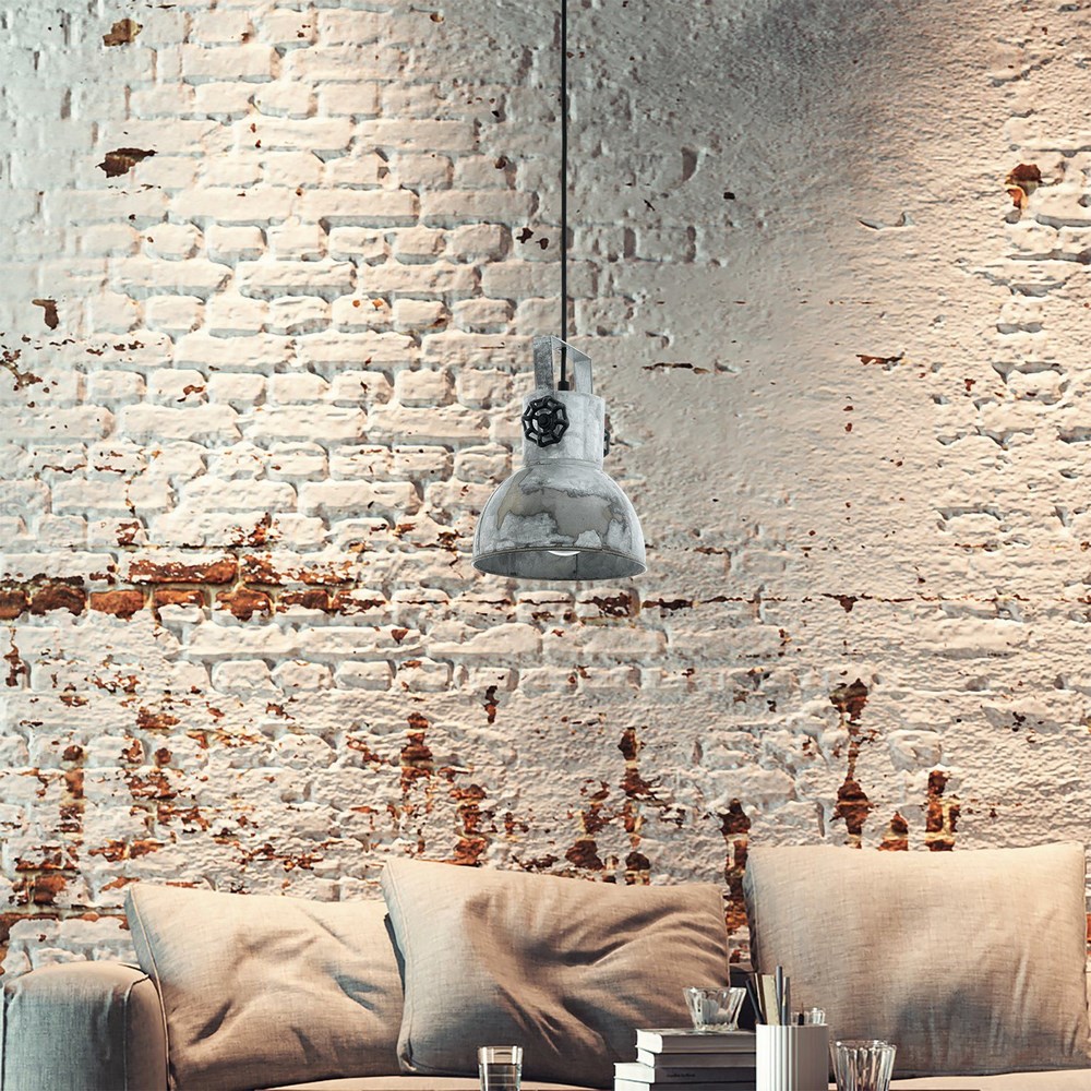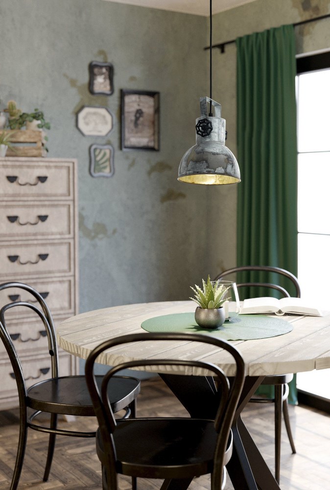 La sospensione é composta da una base tonda in metallo nero opaco. La cupola e' in metallo zincato dall'aspetto vintage e le viti nere di bloccaggio apposte ai lati completano il design della lampada, quest' ultimo puo' essere regolato in altezza.