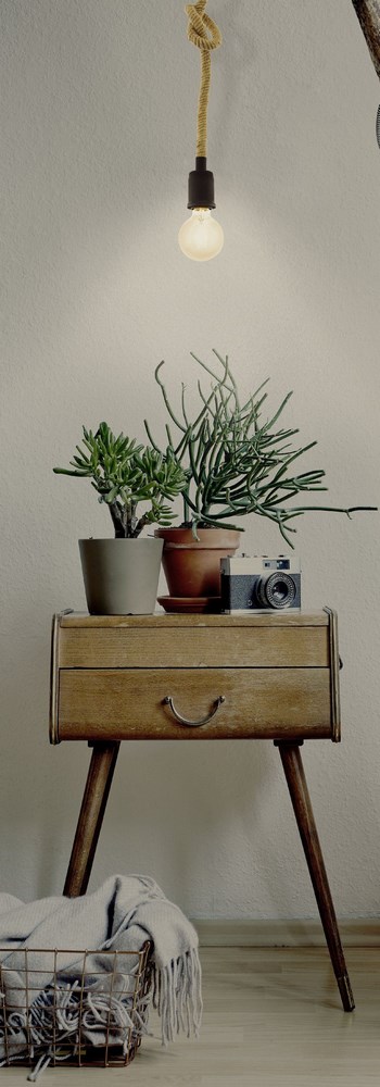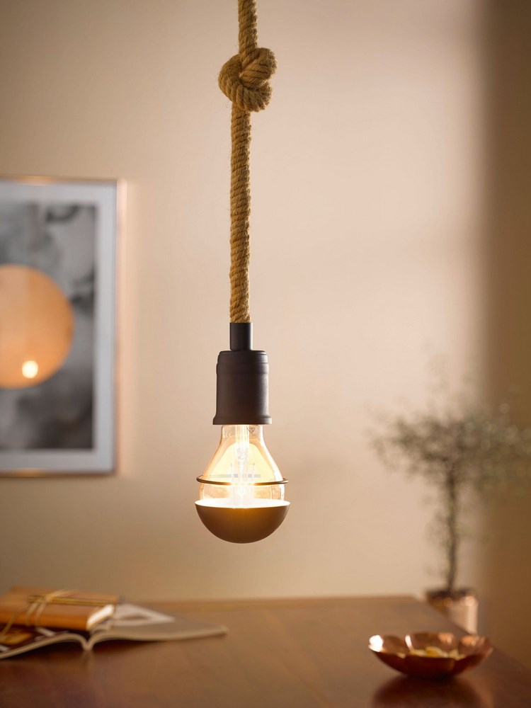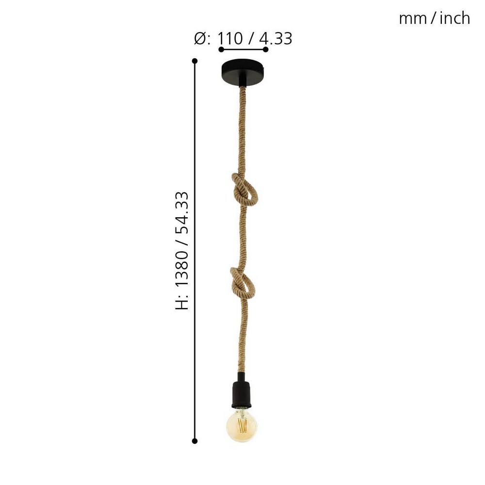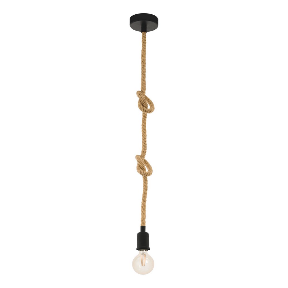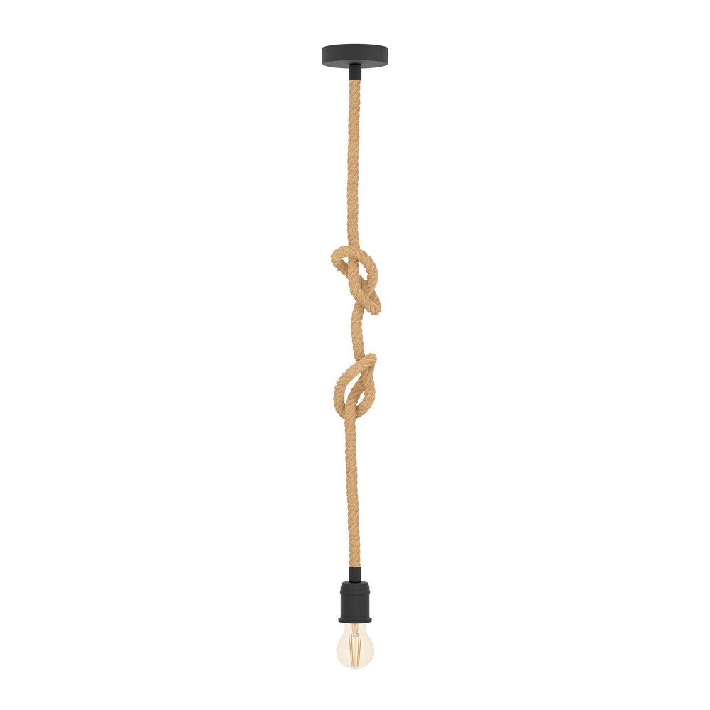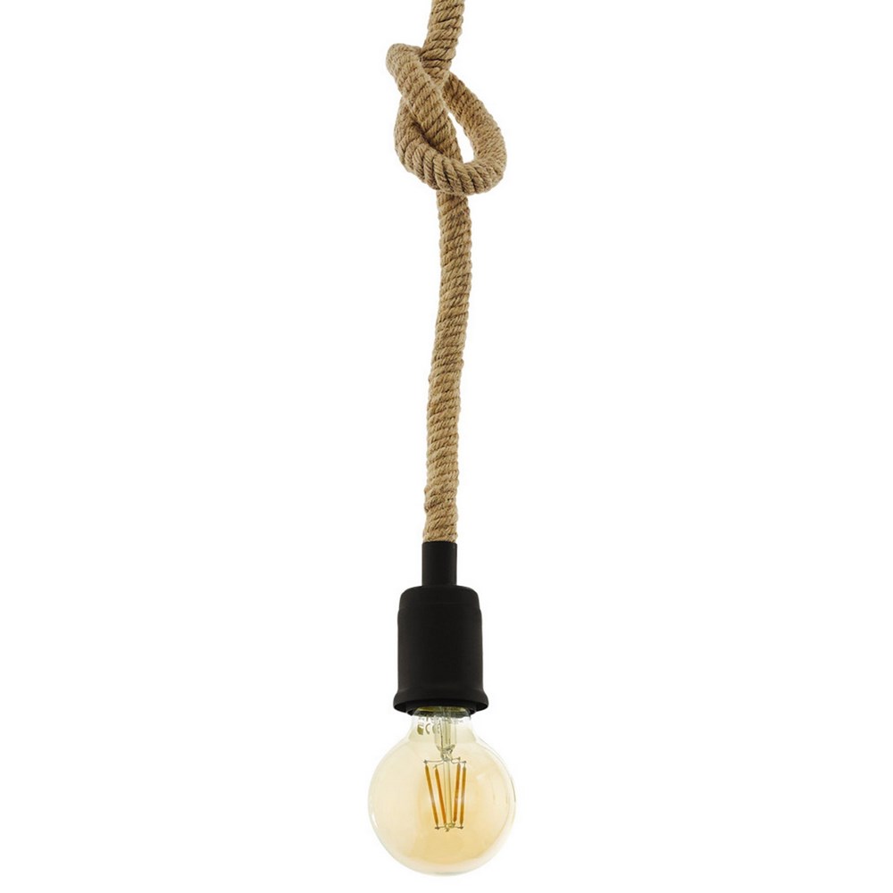 La sospensione é composta da una montatura in corda con portalampada in metallo nero opaco