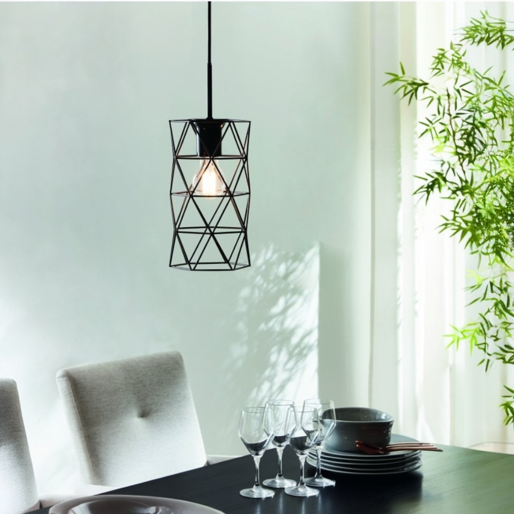 Paralume cilindrico in reticolato marrone scuro che pende da una struttura